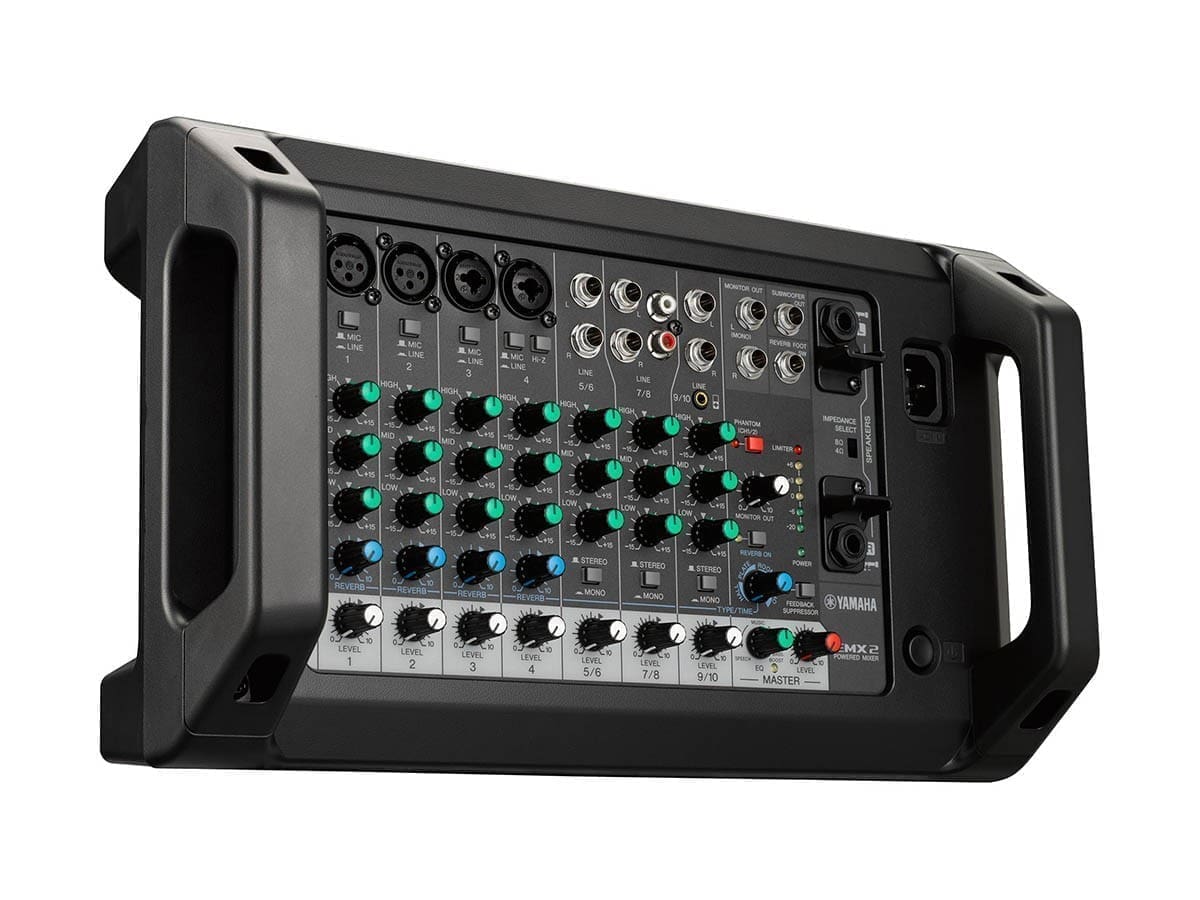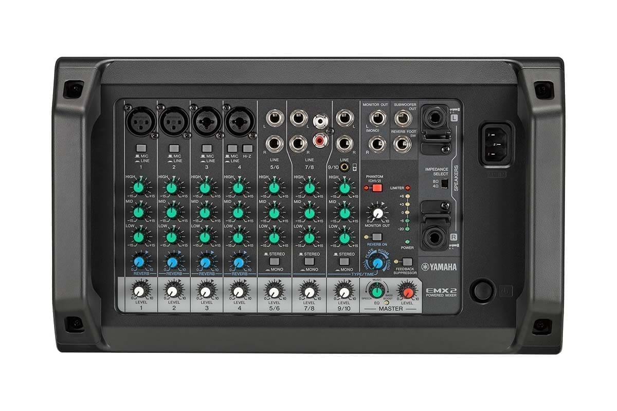 Yamaha EMX2 – 10-канальный активный микшерный пульт мощностью 500 Вт с 4 микрофонными предусилителями, 3-полсоными эквалайзерами, фантомным питанием и встроенным сигнальным процессором.