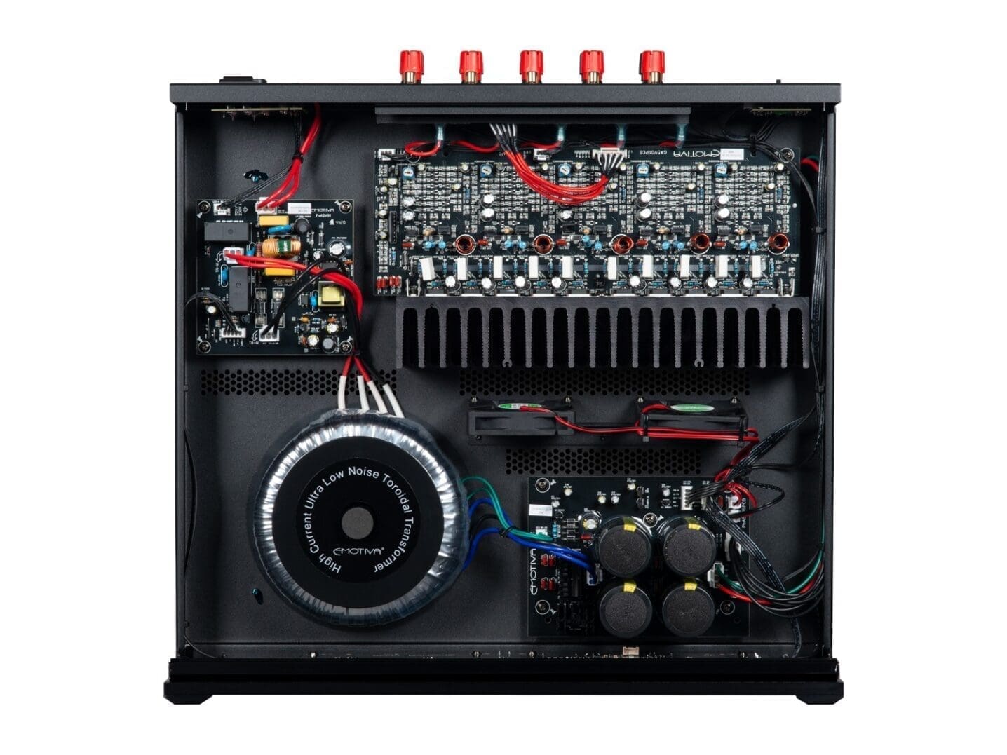 - Мощный линейный источник питания с тороидальным силовым трансформатором увеличенного размера обеспечивает достаточный ток для питания даже сложных динамиков.