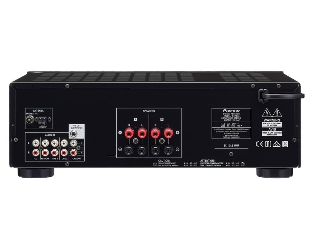 Ресивер оснащен фонокорректором для виниловых вертушек с MM-головками или с MC-картриджами, обладающими выходным напряжением более 2 мВ и сопротивлением более 30 кОм. Кроме разъемов корректора имеются линейные RCA-входы, фиксированный выход для записи и разъем для активного сабвуфера. Присутствует блок цифровых входов (два оптических и один коаксиальный), которые позволяют принимать PCM до 24 бит/192 кГц. Для подсоединения акустических систем служат восемь клемм, благодаря которым можно организовать бивайринговое подключение или же задействовать одновременно две пары 8-омных спикеров, расположенные в разных помещениях. Модель поддерживает работу с 4-омными колонками, но подключать две пары таких АС производитель не рекомендует во избежание перегрузки или перегрева ресивера.