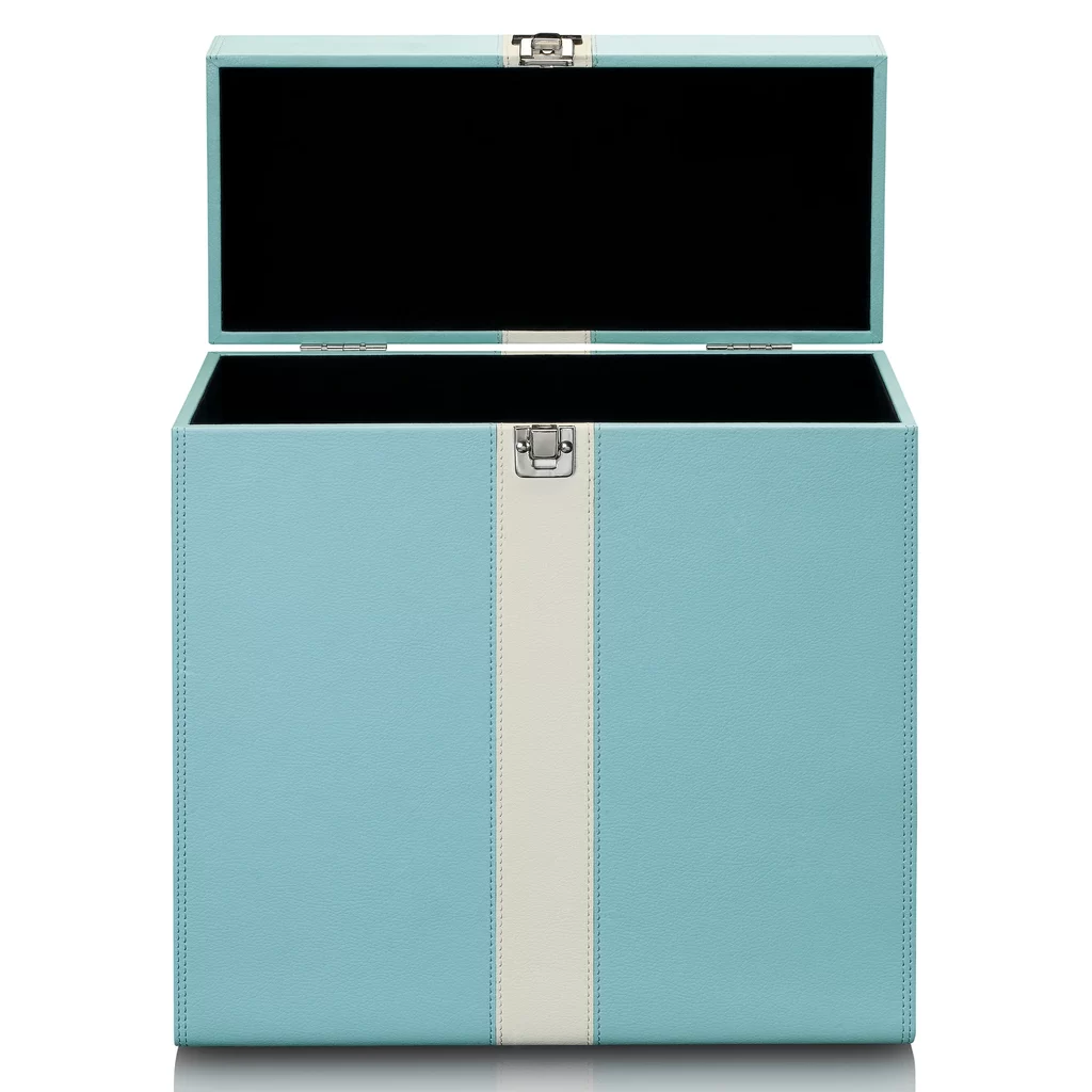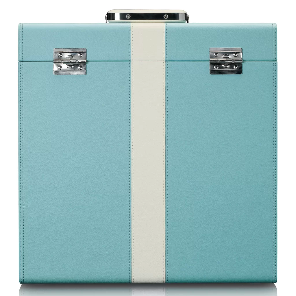 Этот футляр для пластинок мятного цвета выполнен из искусственной кожи и украшен полосой посередине. Внутренняя часть отделана мягким фетром, что обеспечивает максимальную защиту ваших пластинок. Ручка и застежка кейса выполнены из металла.